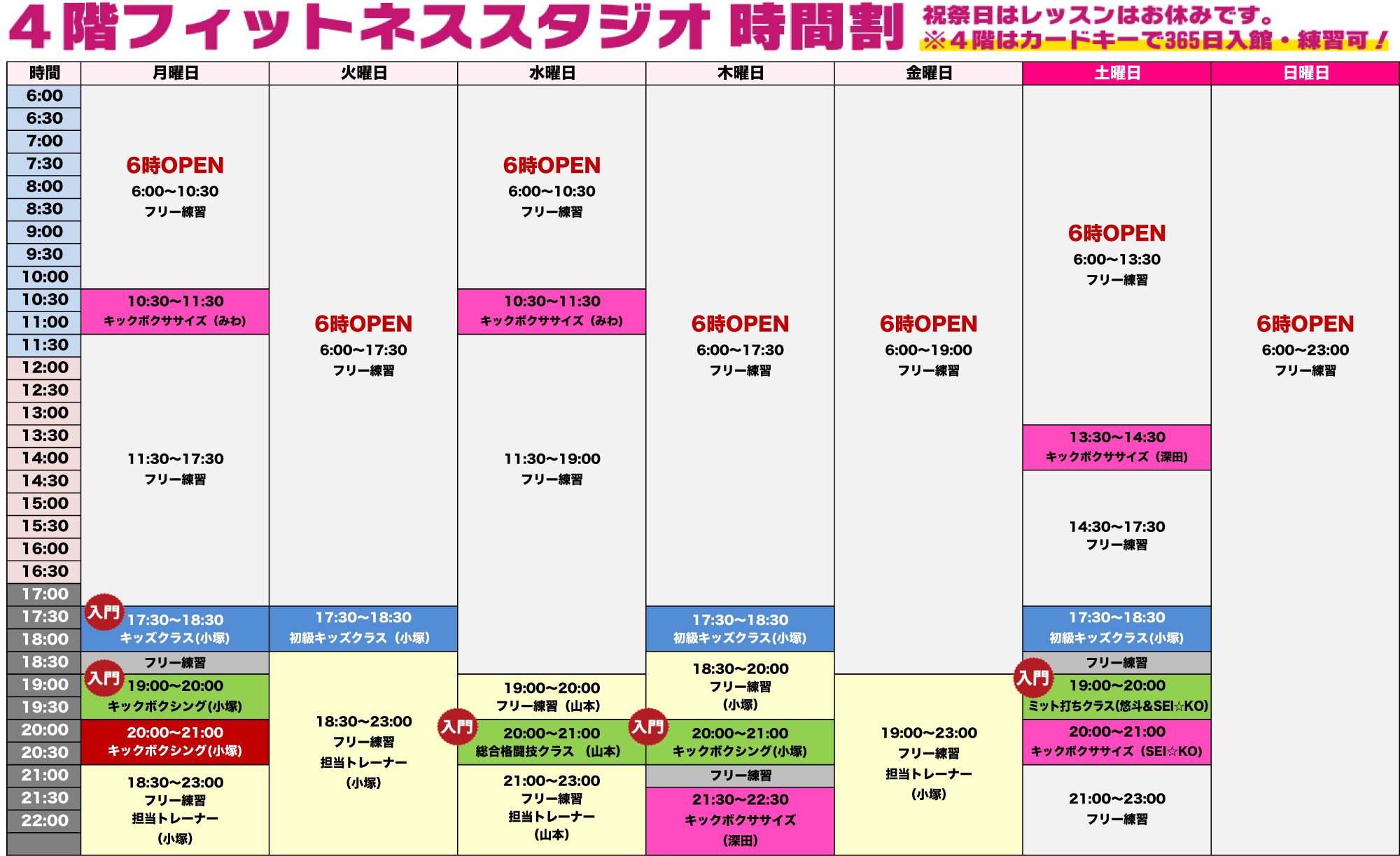 注:祝祭日の授業はお休みになります。 4Fは365日 6:00~23:00使用できます。5Fを使いたい場合はご連絡ください。
